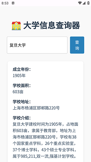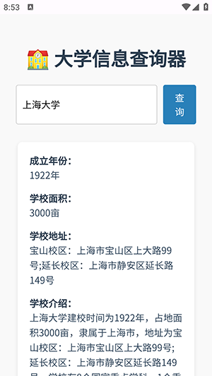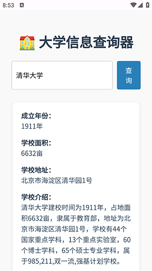 大学信息一键查APP能够快速查询大学相关信息的应用工具,软件完全免费使用,直接在搜索框中快速输入大学名字即可快速查询,搜索结果包含信息均来自互联网,同时还提供了地址等相关信息可以精准查看,方便大家快速搜索相关大学。