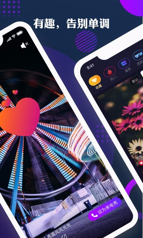 炫来电app是专们为了手机用户所设计的一款手机来电视频软件,通过这个应用软件用户可以为自己设置酷炫的来电秀,让你的来电与众不同,在这里有着海量的精彩视频,有情侣、3D、电音、风景、游戏、动漫、透明主题、重力感应、小姐姐、萌宠等等不同种类的视频资源为你提供,帮助你更好地进行使用,让你在人群中更加的耀眼夺目,非常好用。此app中还可以支持用户自己进行制作专属的视频,将自己手机拍摄的视频、照片进行上传制作即可,非常的简单那,喜欢的朋友赶快来下载使用吧。