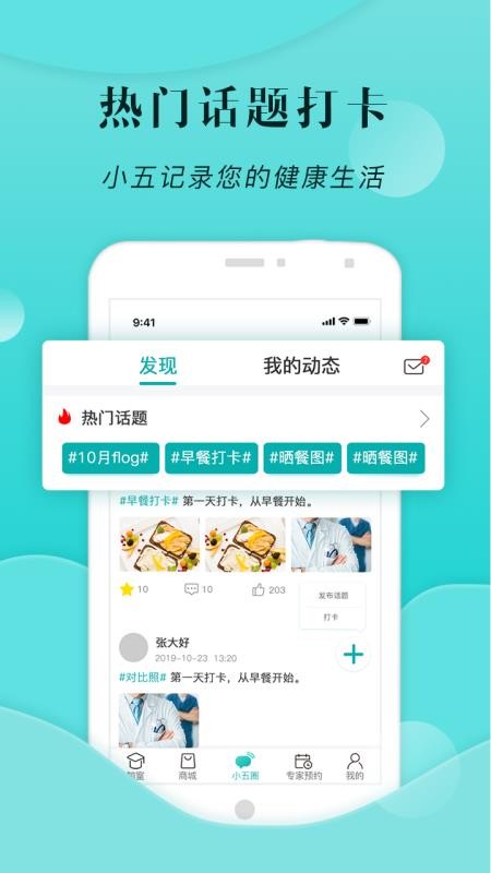 3、进入小五圈功能,参与打卡互动,结识伙伴一起践行健康生活方式。