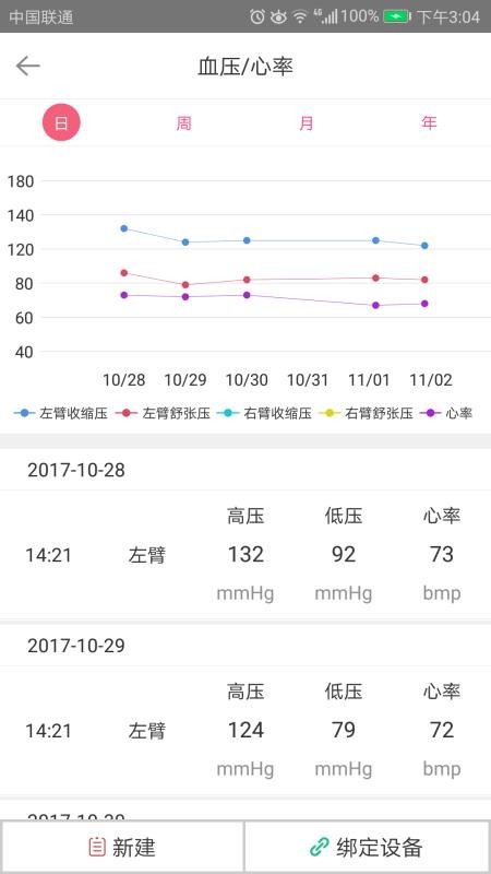 3、查看具体日期的血压心率详情,包括左右臂的高压低压及心率数值。