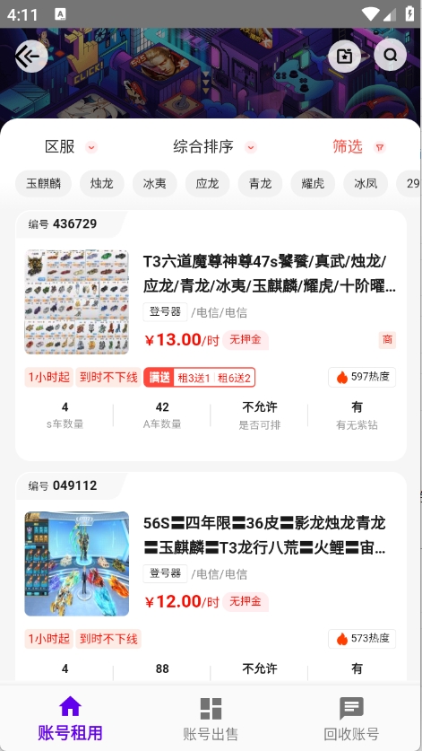 4、软件提供了租号服务,用户可随时在线租号,快速体验各样优质账号。