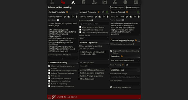 此字段是聊天前角色数据的模板(在内部称为故事字符串)。 这是为文本补全和指令模型格式化角色卡片的主要方式。