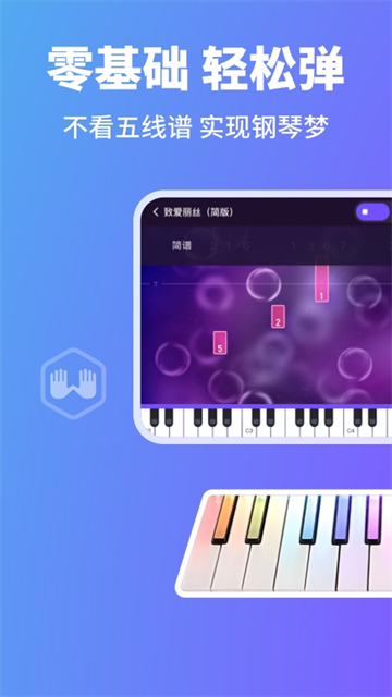 泡泡钢琴App是一款专为零基础用户量身打造的钢琴学习软件,帮助爱好者轻松实现演奏梦想。泡泡钢琴颠覆传统教学模式,无需识读五线谱,通过直观的落键提示与科学的指法指导,帮助用户告别“一指禅”,流畅运用十指弹奏。
