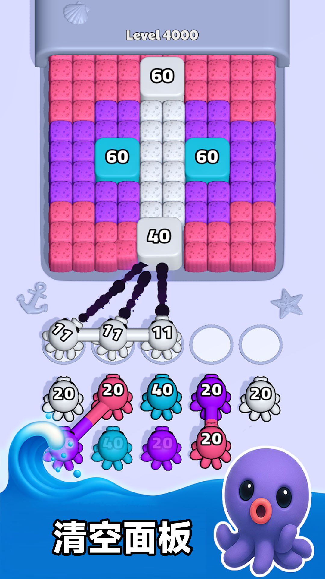 4、消耗所有的章鱼来完成关卡任务,最后不能剩余任何方块,玩家要使用合适的顺序进行消除。