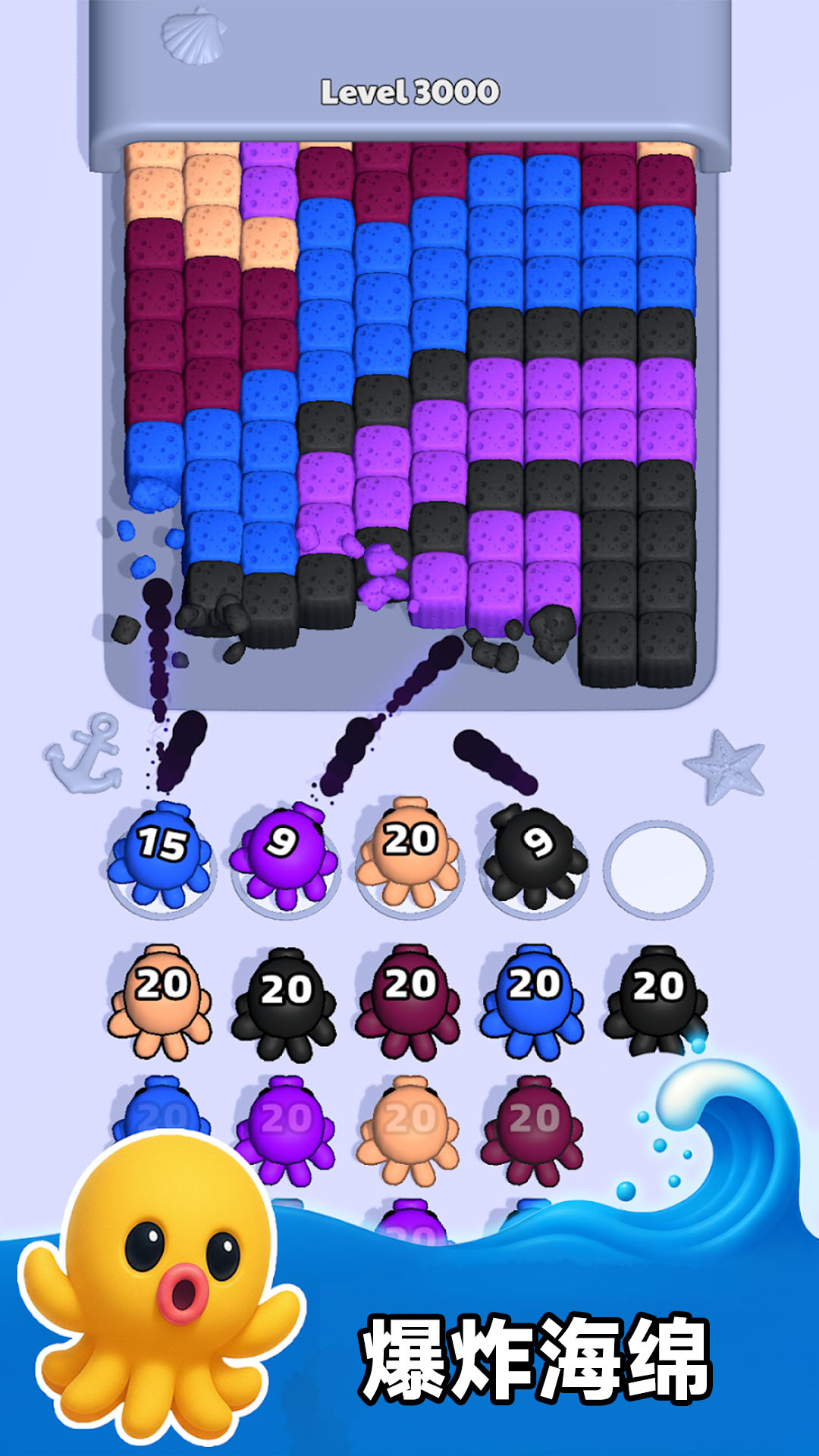 2、每关核心目标为清空网格内所有海绵,随着关卡推进,网格布局复杂度提升,达成目标的难度逐步增加。