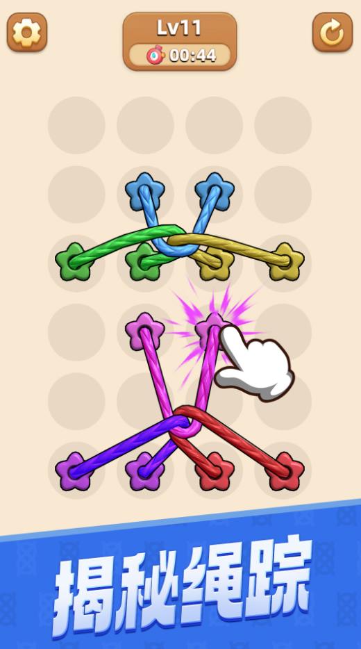 极限脑力大挑战是一款绳结解谜的益智闯关游戏,以错综复杂的绳结为核心谜题,考验玩家的观察力与空间想象力,关卡设计由浅入深,从简单缠绕到复杂结构逐步升级,无倒计时与步数限制,搭配柔和配色与简约界面,玩家可按自身节奏解开绳结,让小人抵达目标位置。