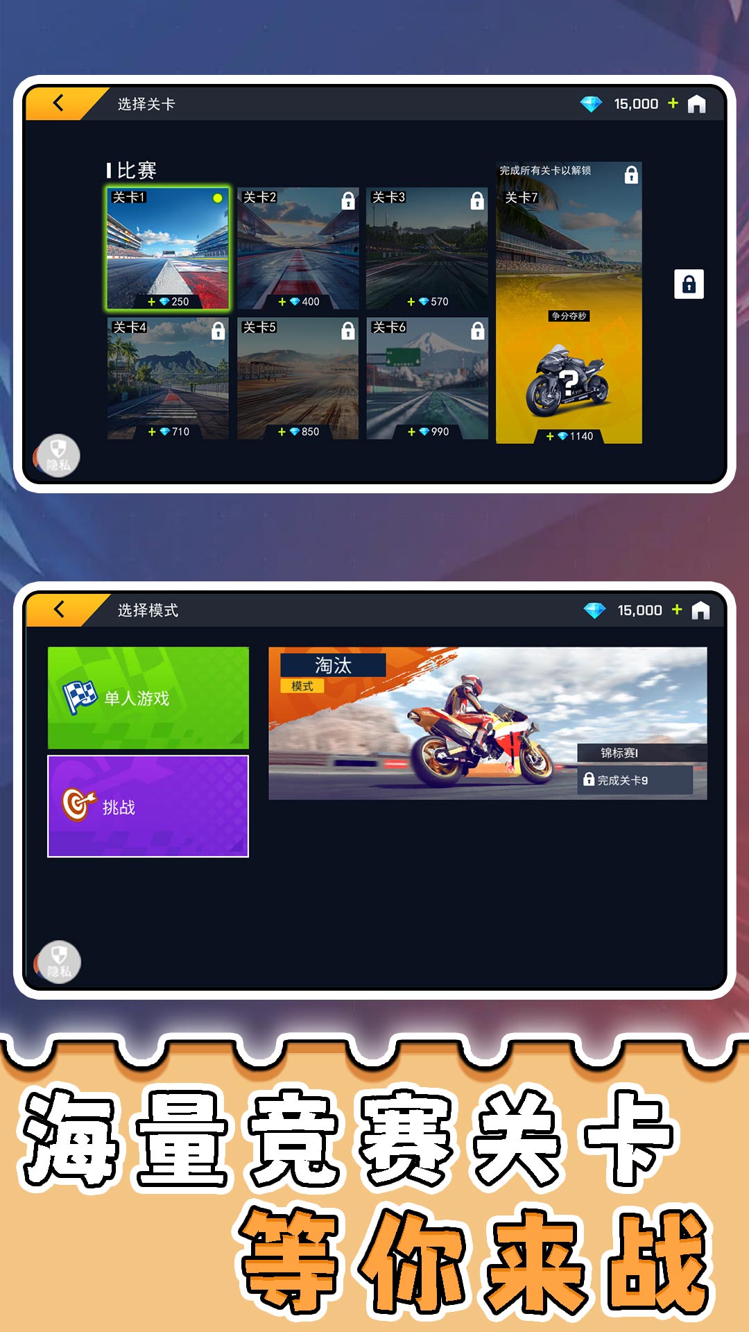 2、解锁新摩托车后先在低难度赛道试飞,熟悉其操控手感与性能极限,再投入高难度对决。