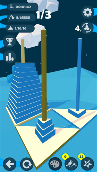 3、包含大量渐进式关卡设计,从简单到困难逐步增加圆盘数量和挑战难度,需要玩家灵活运用策略完成目标。