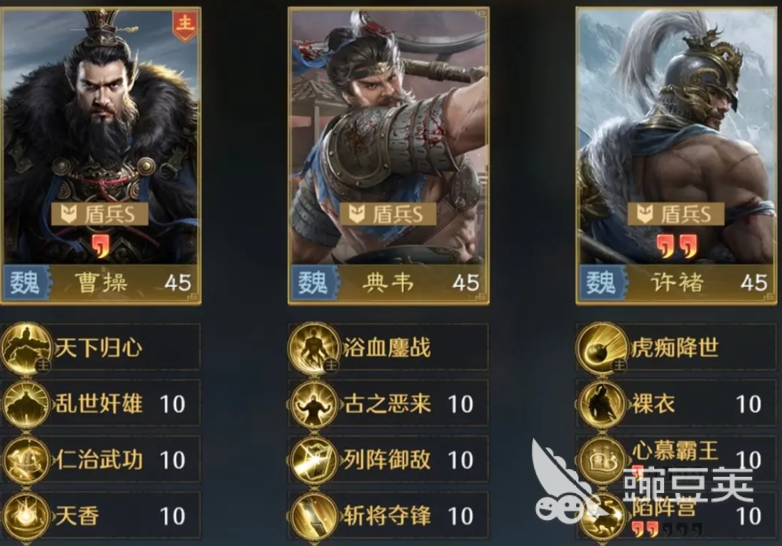 九牧之野霸王盾队伍搭配的核心就是三个武将技能、兵法完全相同,典韦、许褚前排高频反击,曹操全队增益加治疗。该组合开荒、野战、副本挑战输出稳定、输出可观且续航足。虽然英雄的品质以及技能配置都有一定的要求,但是成型之后,霸王盾阵容可以说是非常划算,在各种战斗场景下都能持续发挥出强大的战斗力,给玩家带来稳定的竞技优势。