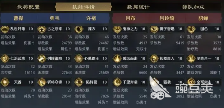 每位武将都必须挑选和自己的定位相匹配的技能。曹操可以利用“仁治武功”“刮骨疗毒”“资军后勤”等技能来加强治疗和辅助,配合使用“天香”“离害近强”“坚阵合一御阵守卫”增加减伤增伤。典韦使用列阵御敌、戒备、斩将夺锋、鼓破千雷、重创来保证反击输出的稳定和伤害的叠加。许褚推荐的心慕霸王、强袭、反击、陷阵营、虎贲军、拔目啖睛等技能可以增加前排的压制力和反击连锁。依靠这些技能组合,在开荒和打架的情况下都能发挥出高效的作用。